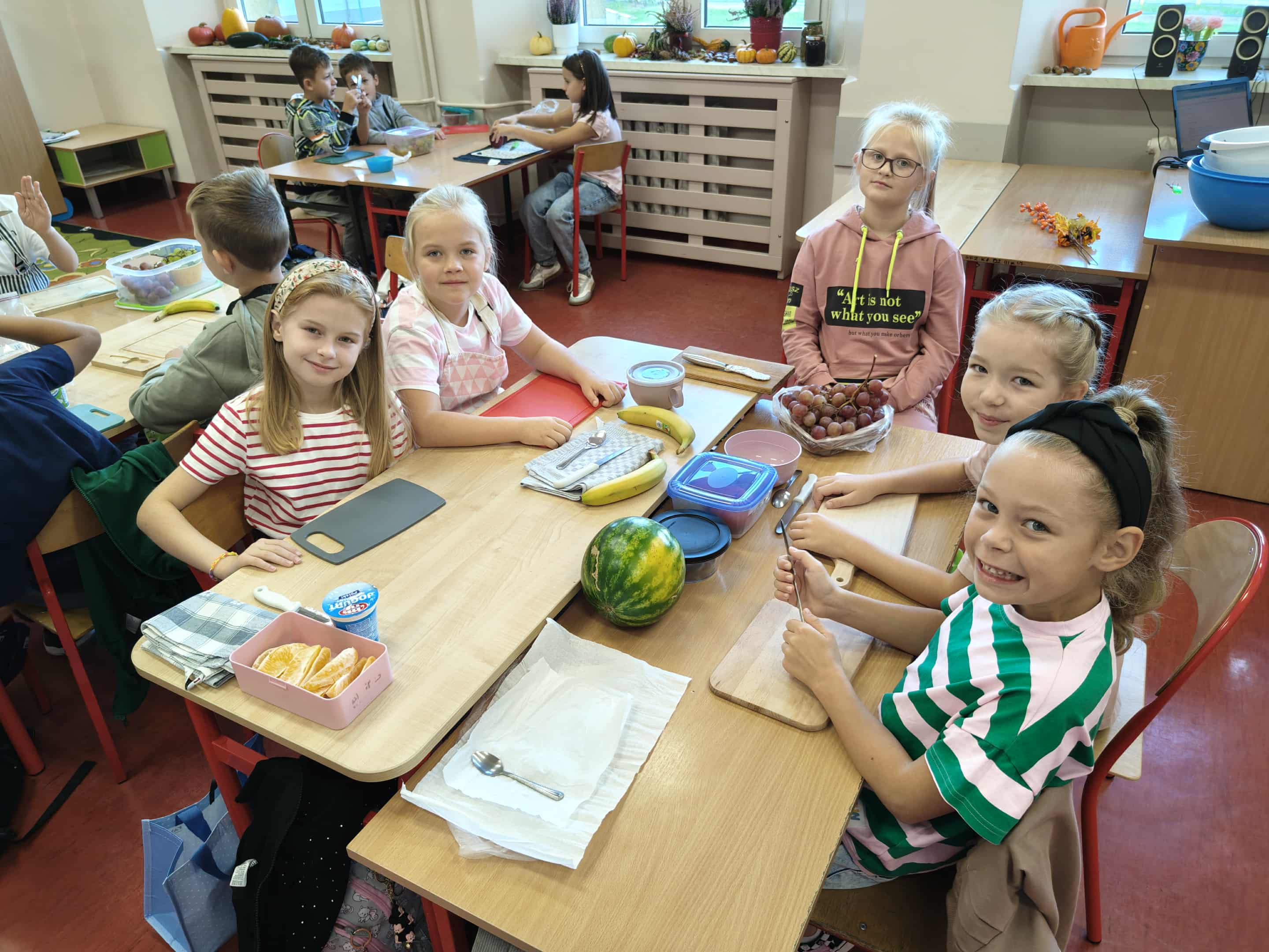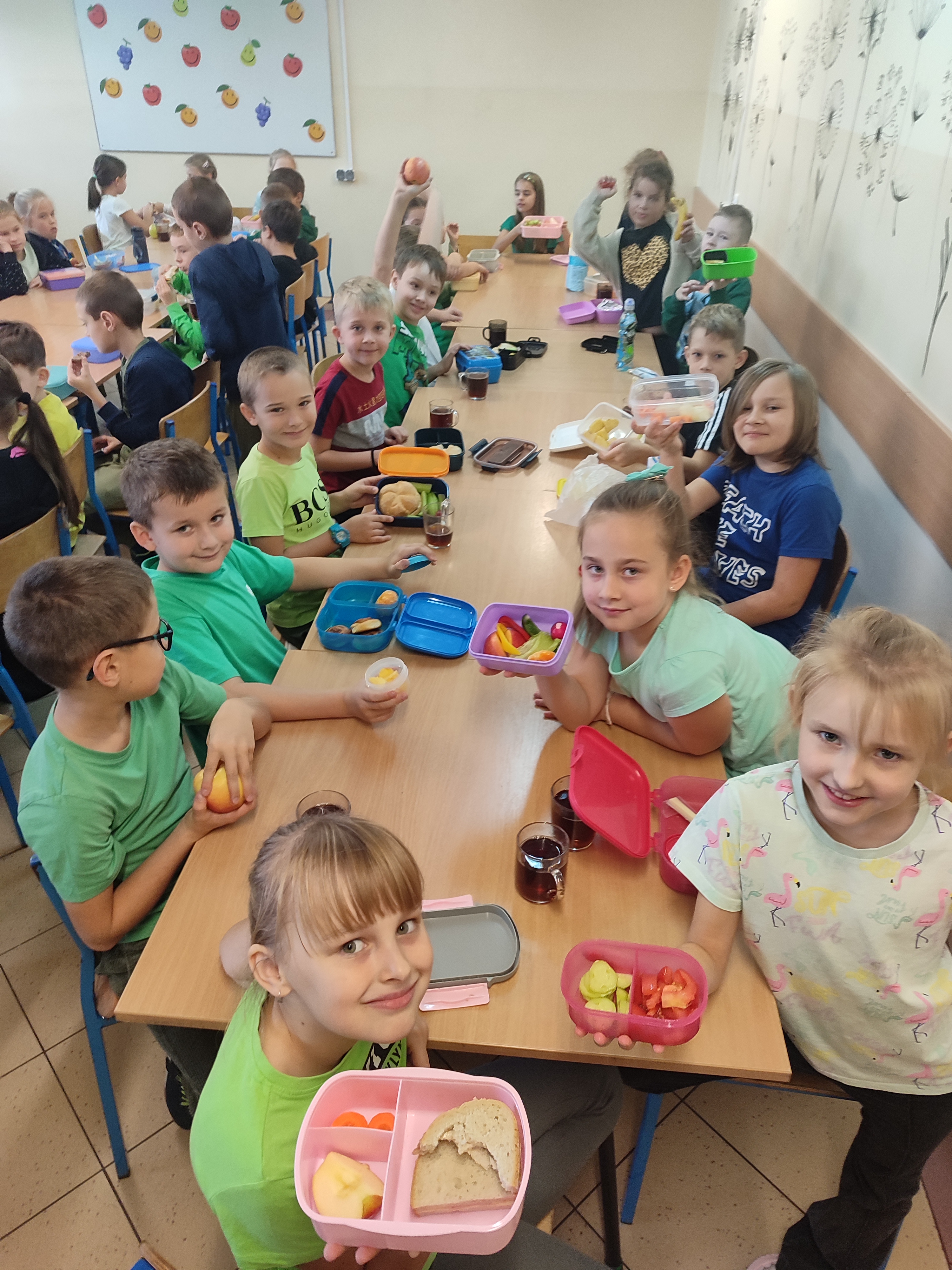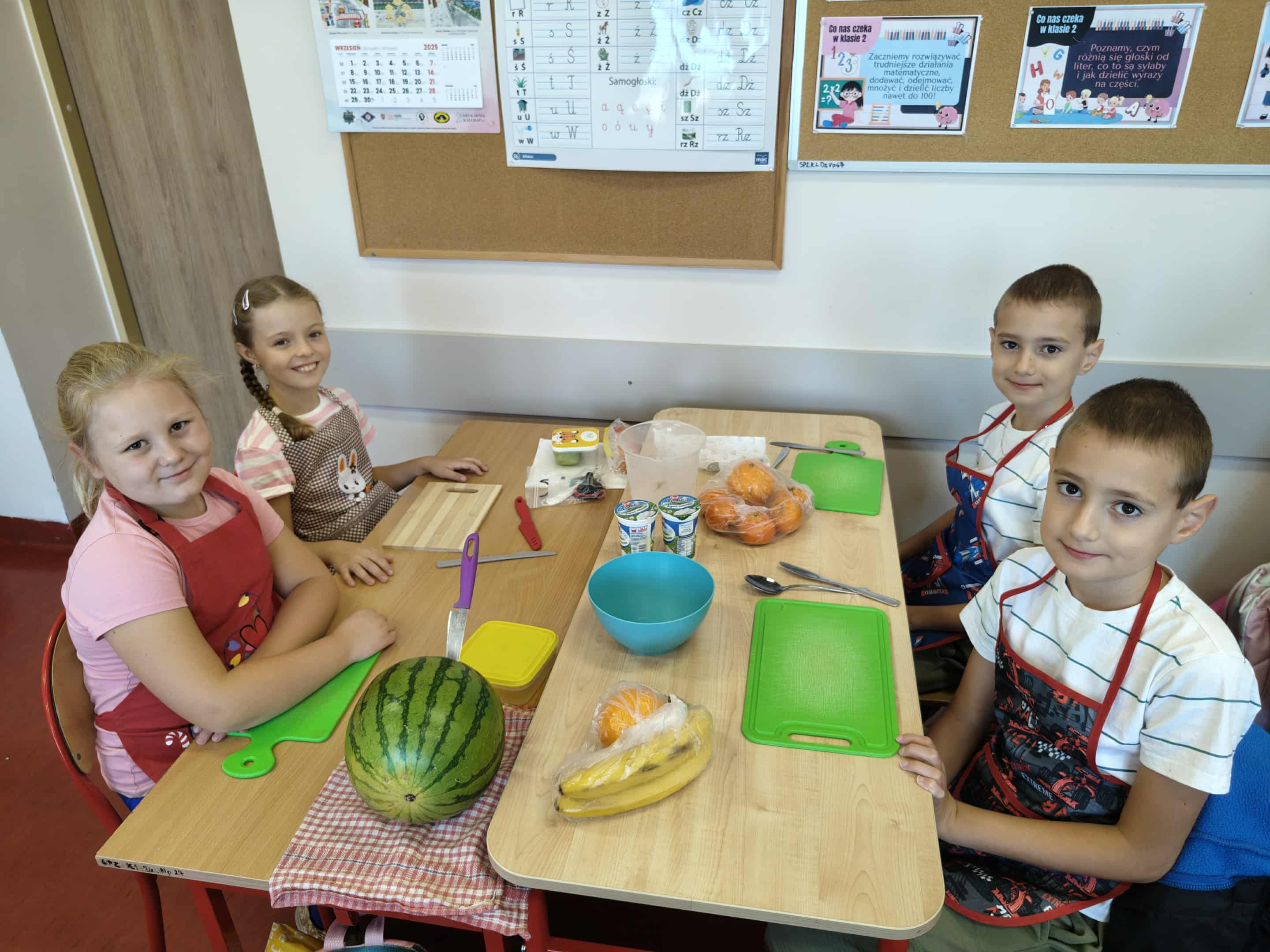 Uczniowie klas I–III przynieśli do szkoły warzywa i owoce, podkreślając rolę zdrowego odżywiania w codziennym funkcjonowaniu. Wspólnie z wychowawcami przygotowywali zdrowe, kolorowe przekąski i sałatki, ucząc się, że wspólne gotowanie może być źródłem radości, relaksu i integracji. Odbyły się również pogadanki na temat wpływu zdrowego odżywiania na zdrowie psychiczne – uczniowie dowiedzieli się, jak właściwa dieta wspiera dobre samopoczucie, koncentrację i energię do działania.