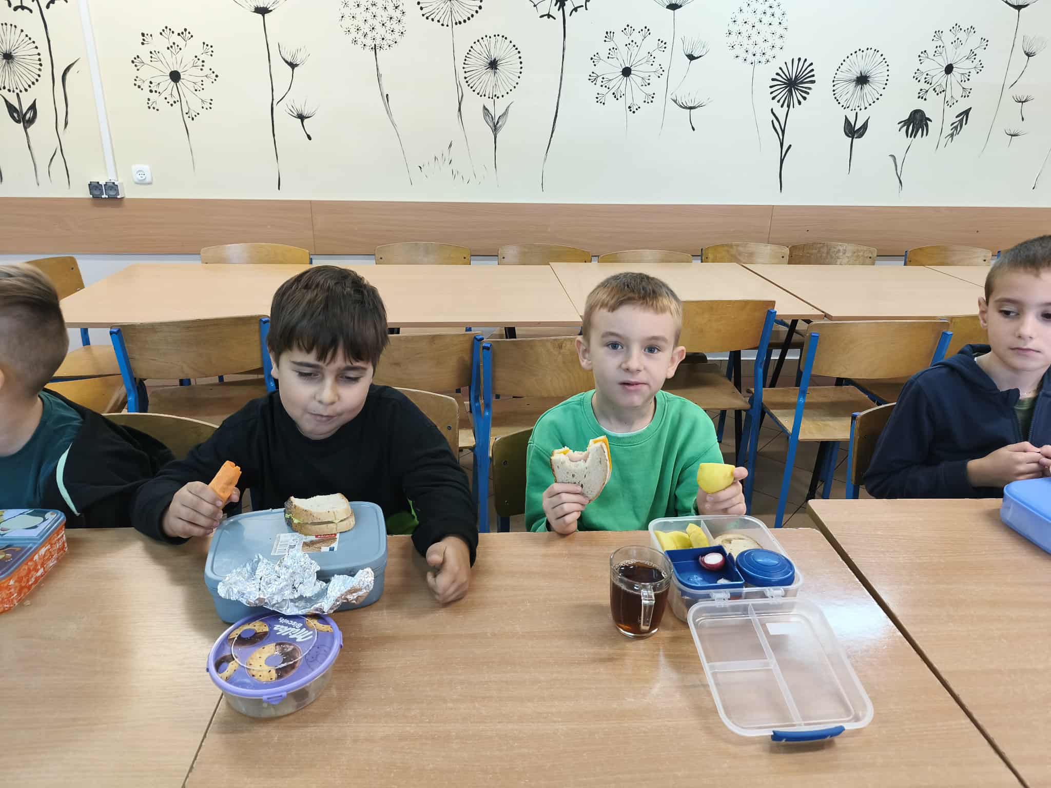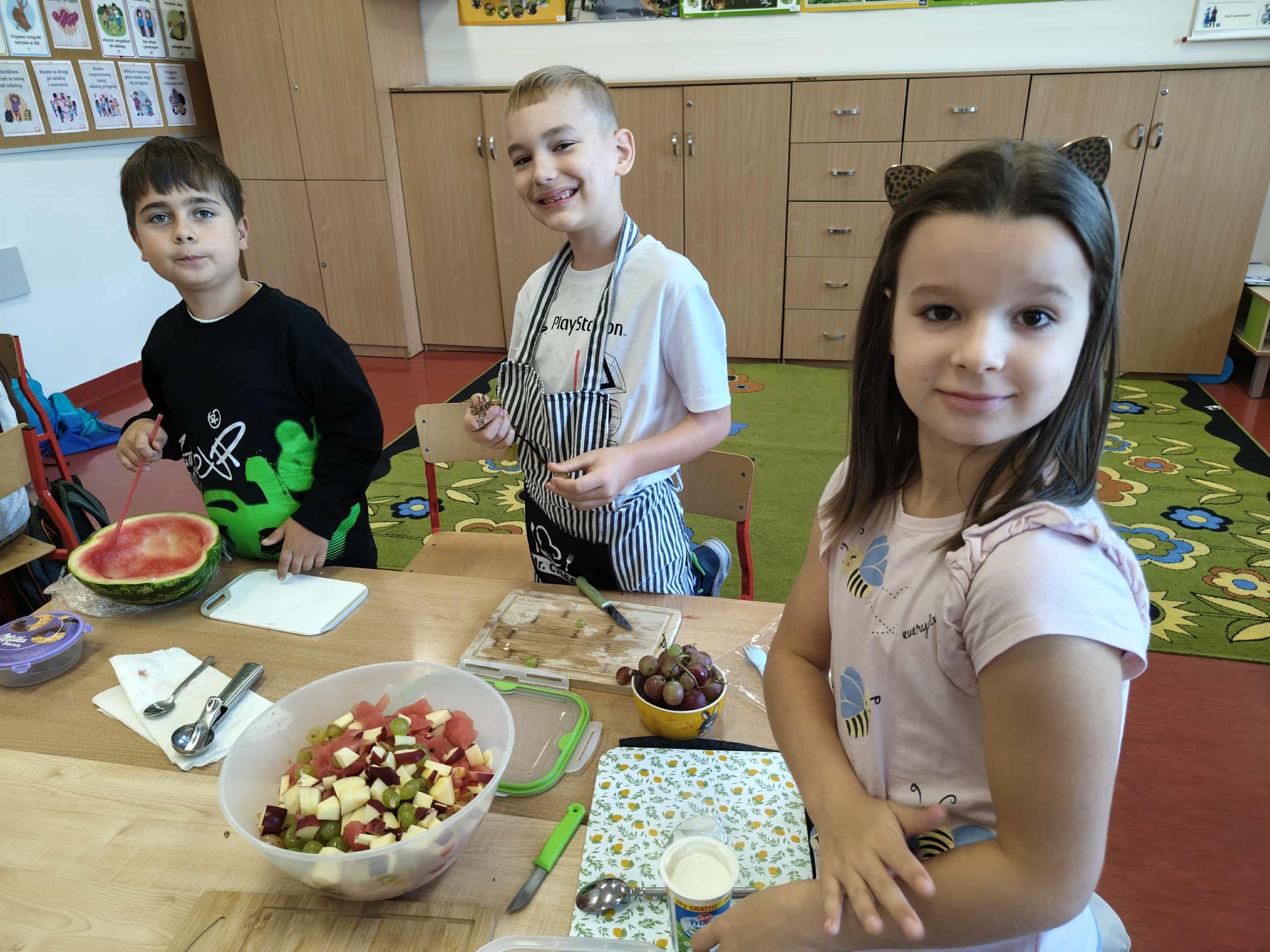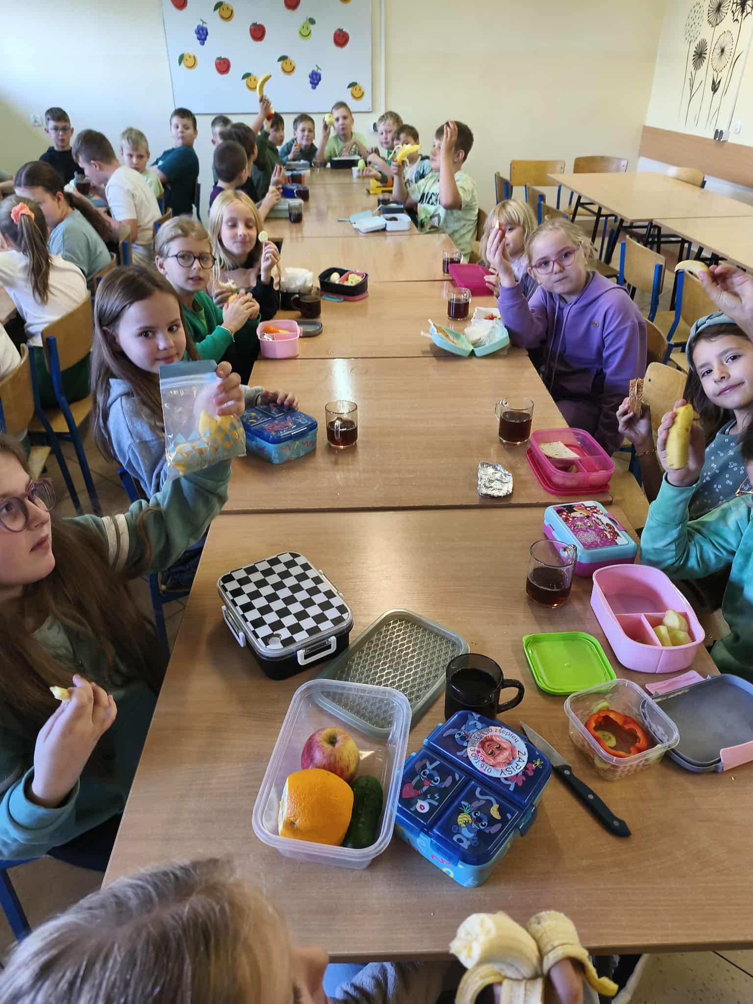 Uczniowie klas I–III przynieśli do szkoły warzywa i owoce, podkreślając rolę zdrowego odżywiania w codziennym funkcjonowaniu. Wspólnie z wychowawcami przygotowywali zdrowe, kolorowe przekąski i sałatki, ucząc się, że wspólne gotowanie może być źródłem radości, relaksu i integracji. Odbyły się również pogadanki na temat wpływu zdrowego odżywiania na zdrowie psychiczne – uczniowie dowiedzieli się, jak właściwa dieta wspiera dobre samopoczucie, koncentrację i energię do działania.