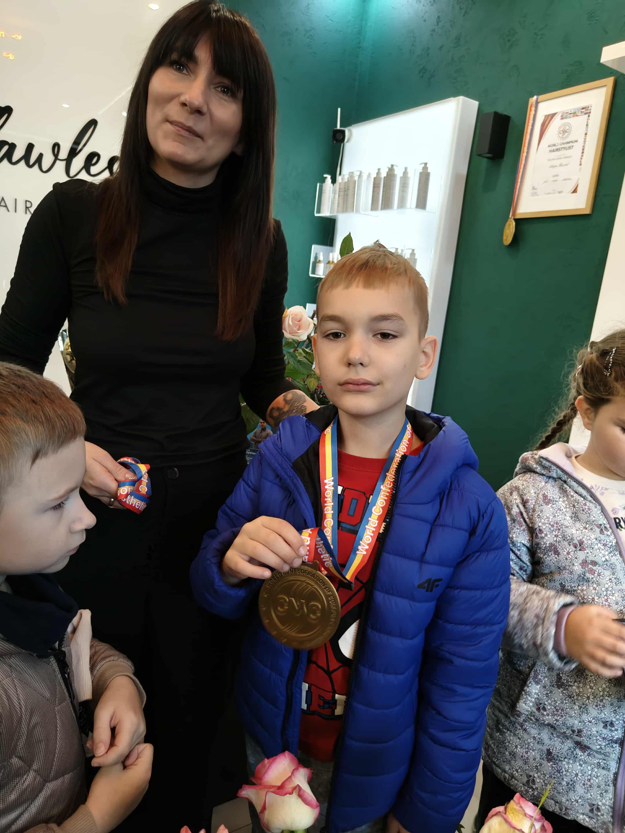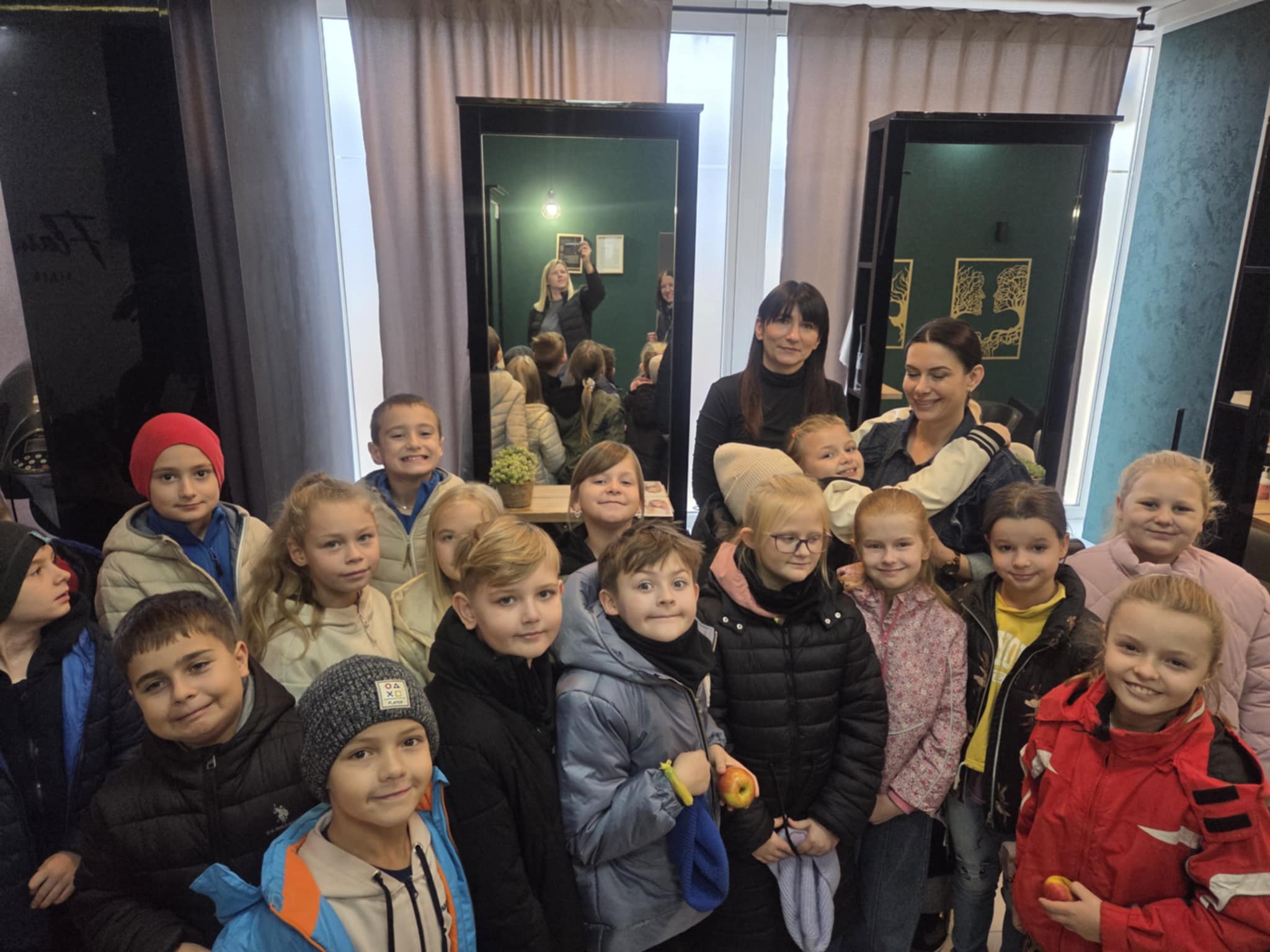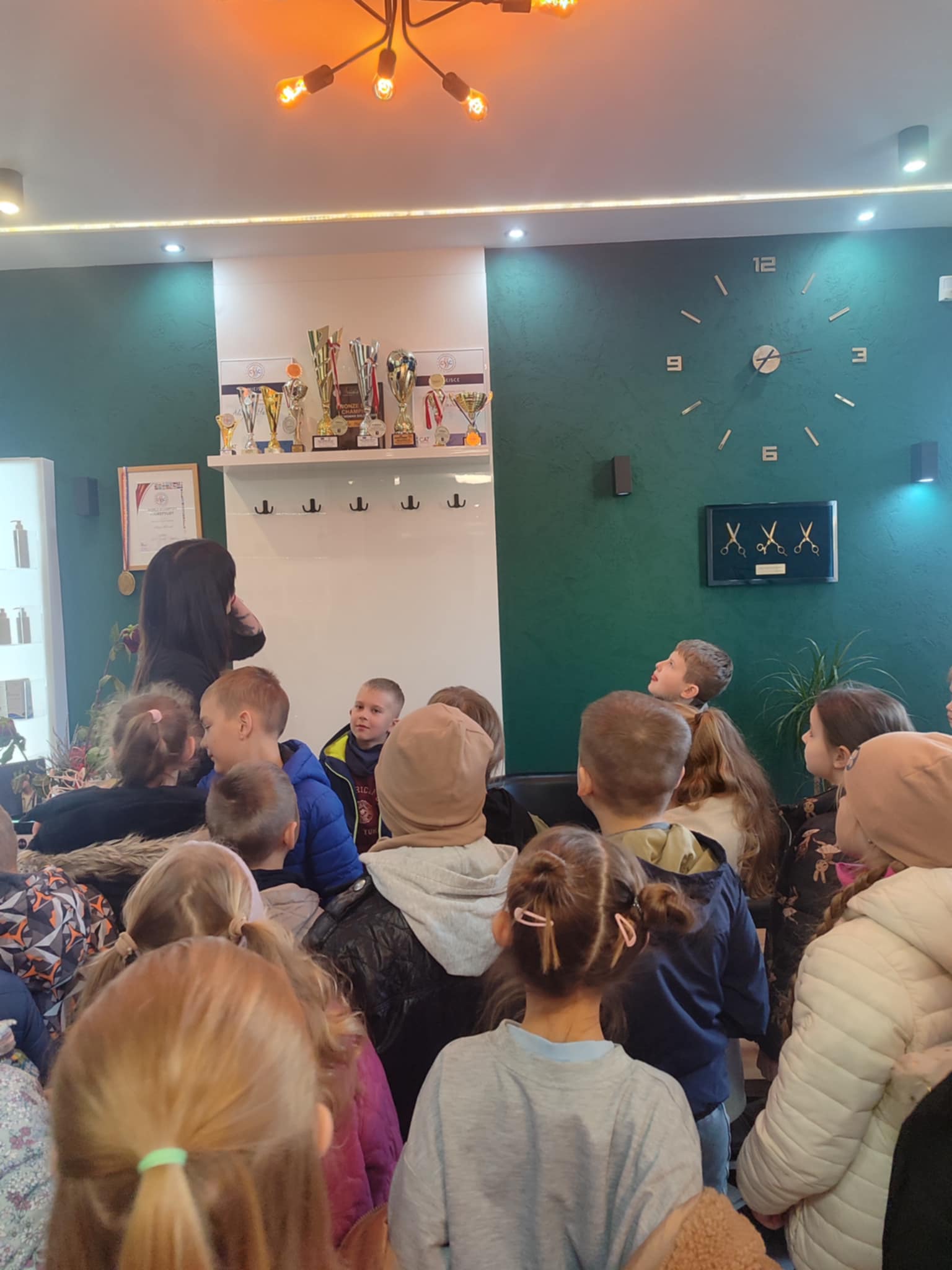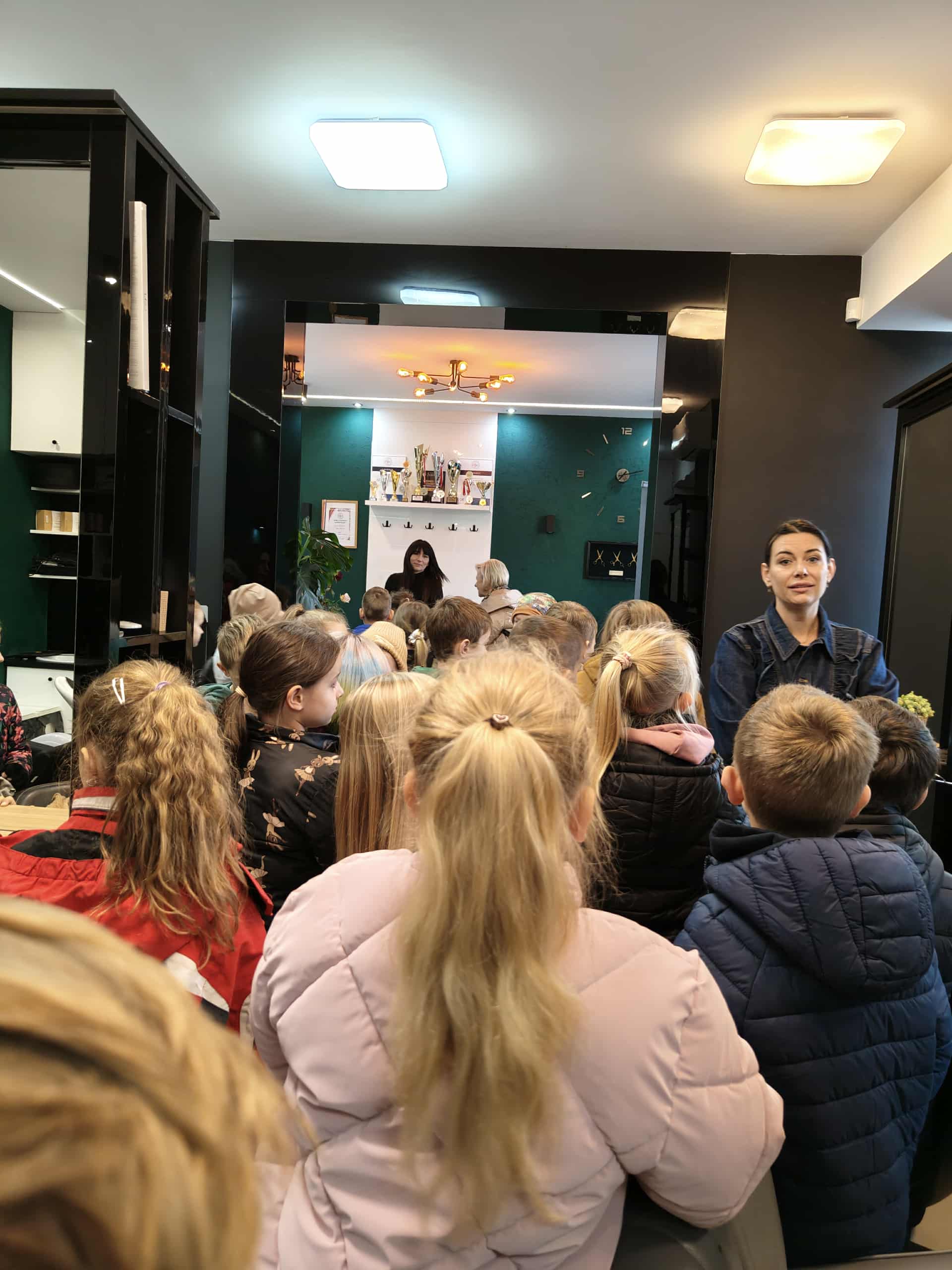 Następnie udaliśmy się do zakładu fryzjerskiego „Flawless Hairstyle”, w którym pracuje pani Anna Andrzejak – mama naszej uczennicy Eleny. Pani Anna wraz ze swoją koleżanką, panią Alicją Musiał, opowiedziały nam o zawodzie fryzjera, pokazały profesjonalne narzędzia oraz techniki strzyżenia i stylizacji włosów. Dowiedzieliśmy się, jak wygląda codzienna praca w salonie fryzjerskim i jak ważne są umiejętności oraz kontakt z klientem. Duże wrażanie wywarł na naszych uczniach fakt, że pani Alicja jest mistrzynią świata we fryzjerstwie damskim, zdobyła wiele medali oraz pucharów, które mieliśmy możliwość zobaczyć. Serdecznie dziękujemy Pani Ani oraz Pani Alicji za gościnność oraz bardzo ciekawe spotkanie.