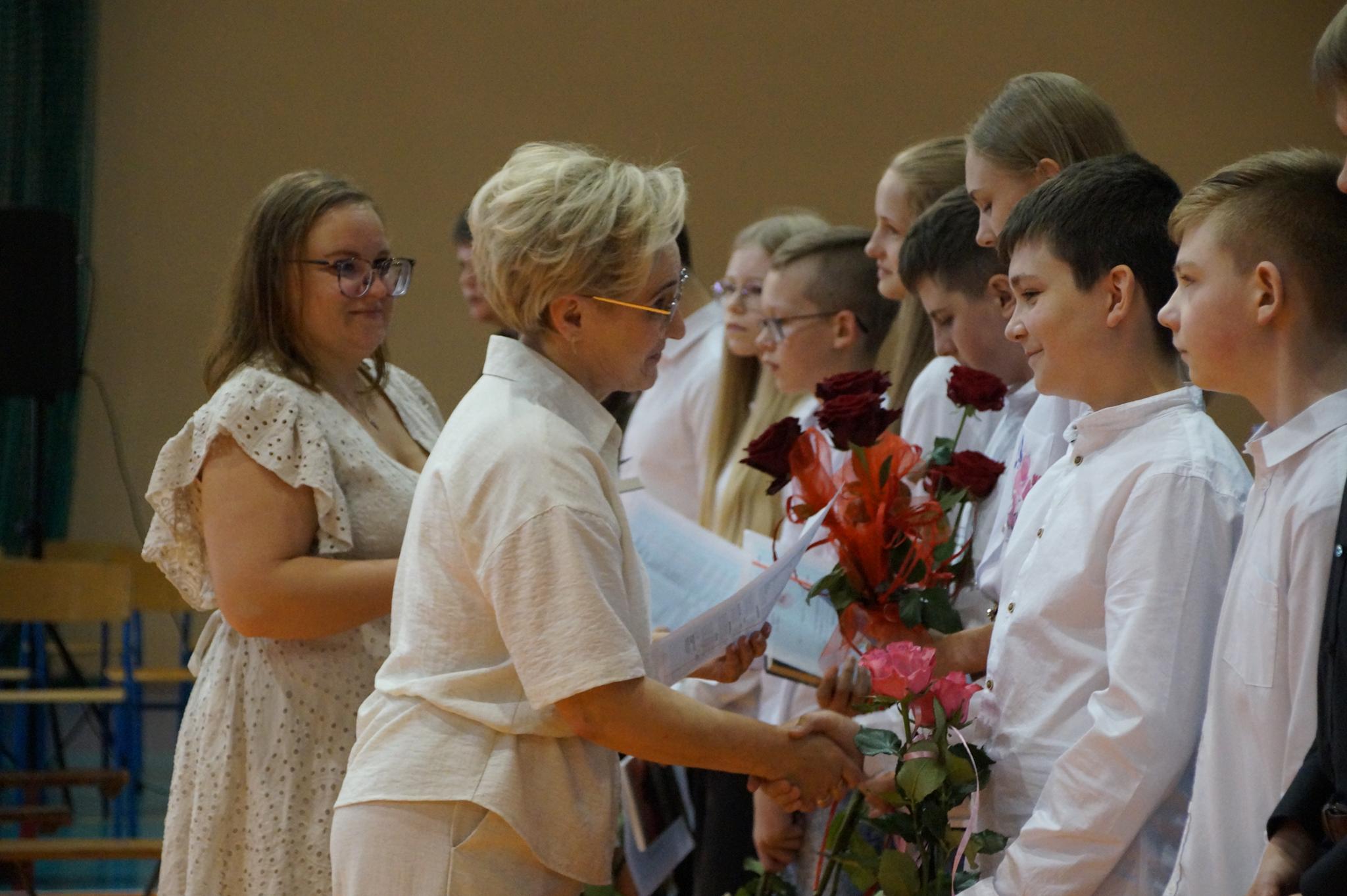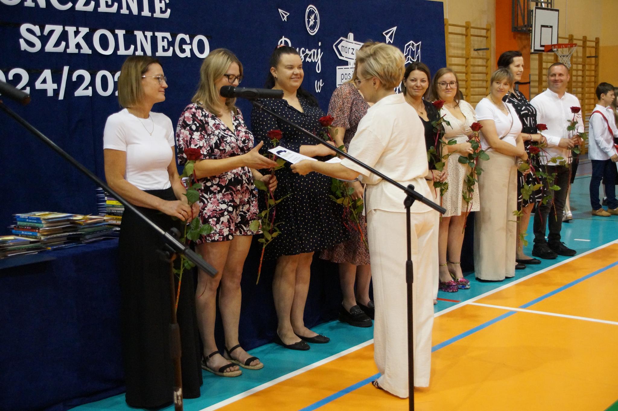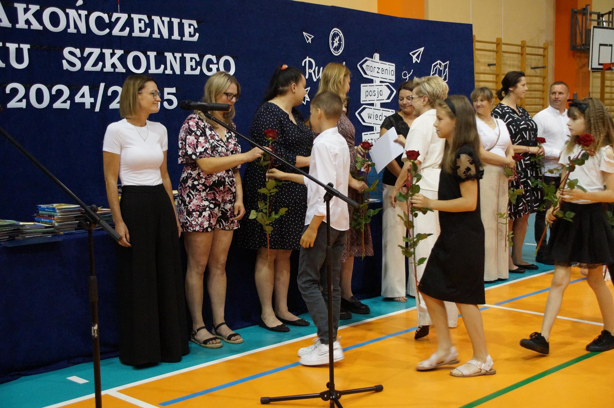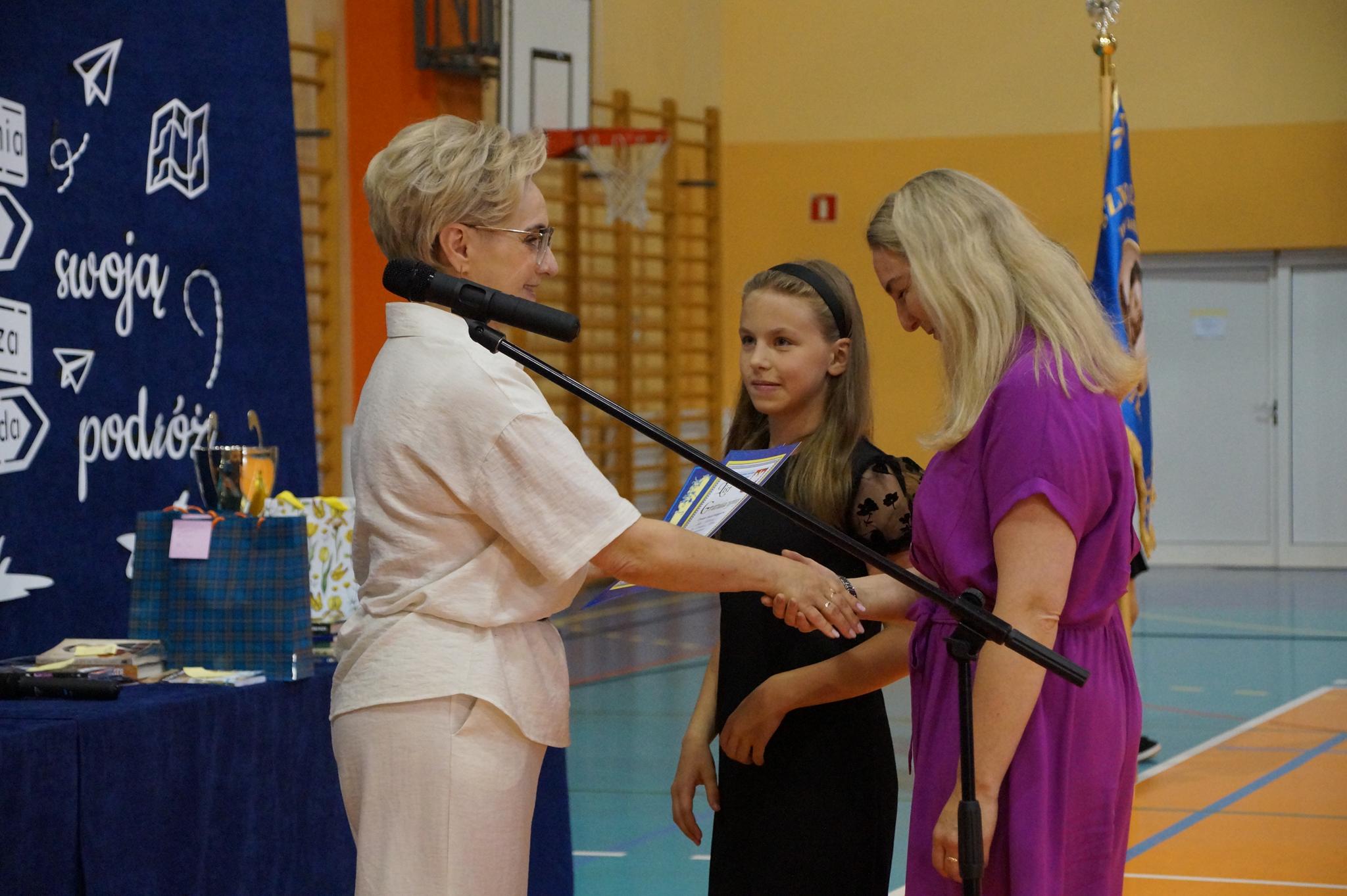 Podczas uroczystości dyrektor Małgorzata Szczucka, wicedyrektor Emila Jagiełło, przedstawicielka Rady Rodziców pani Nicola Guźniczak z wychowawcami wręczyli nagrody i wyróżnienia. Pani dyrektor podziękowała wszystkim za zaangażowanie w realizację szkolnych projektów i przedsięwzięć.