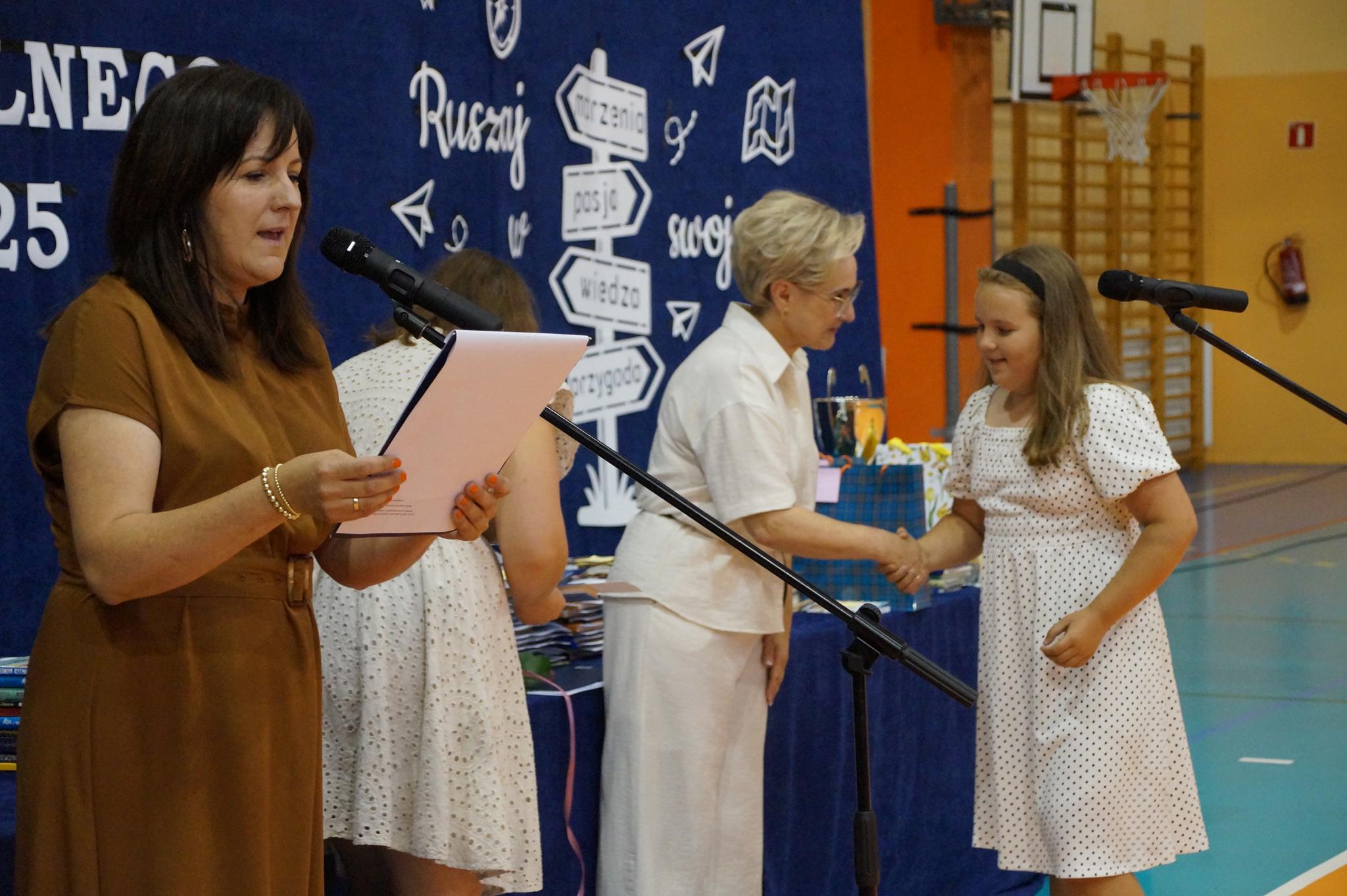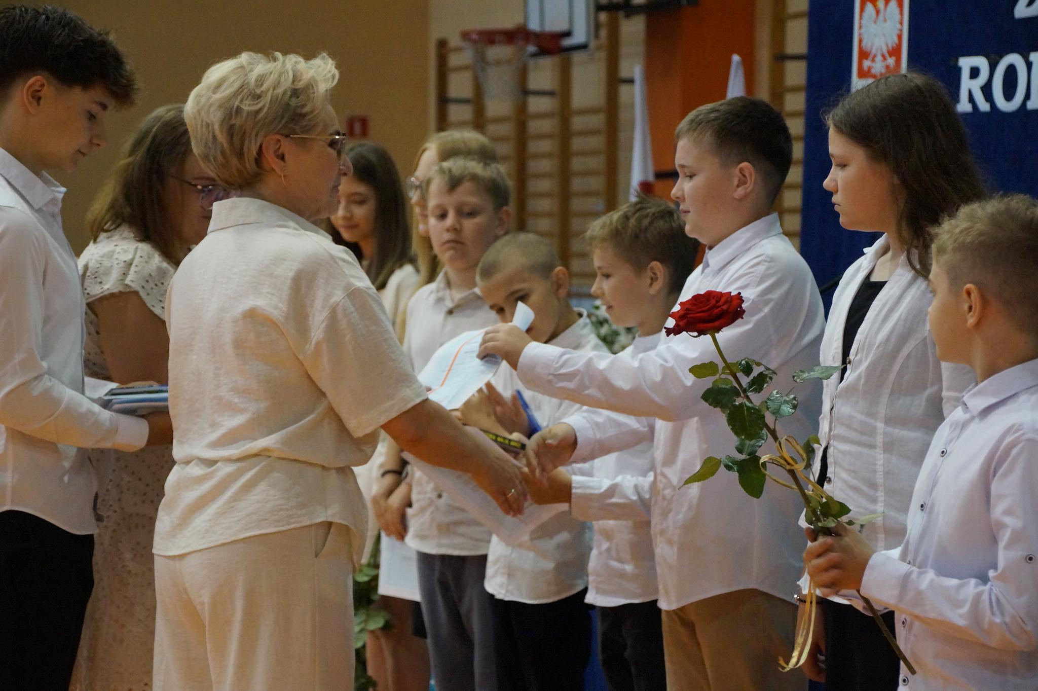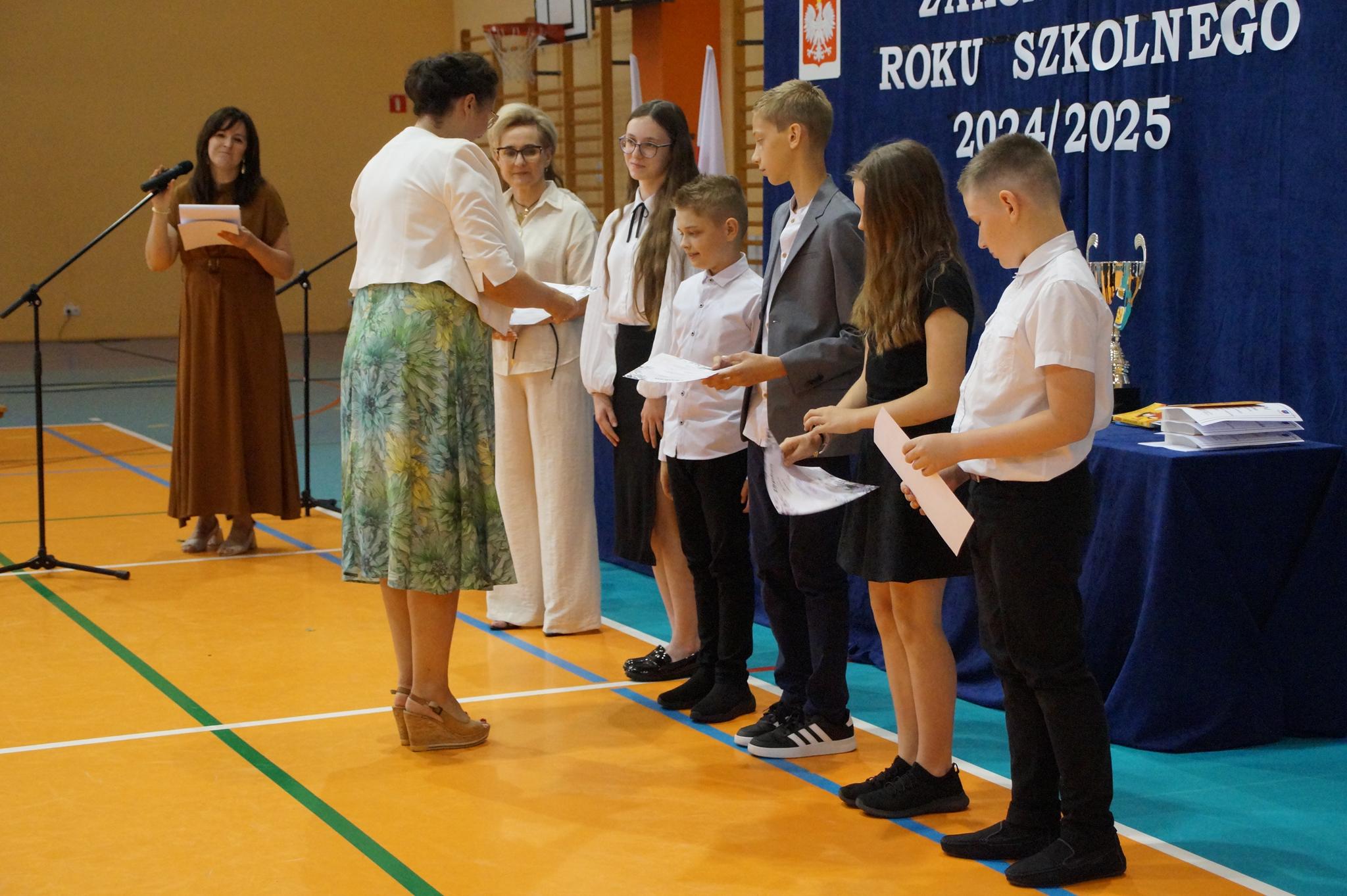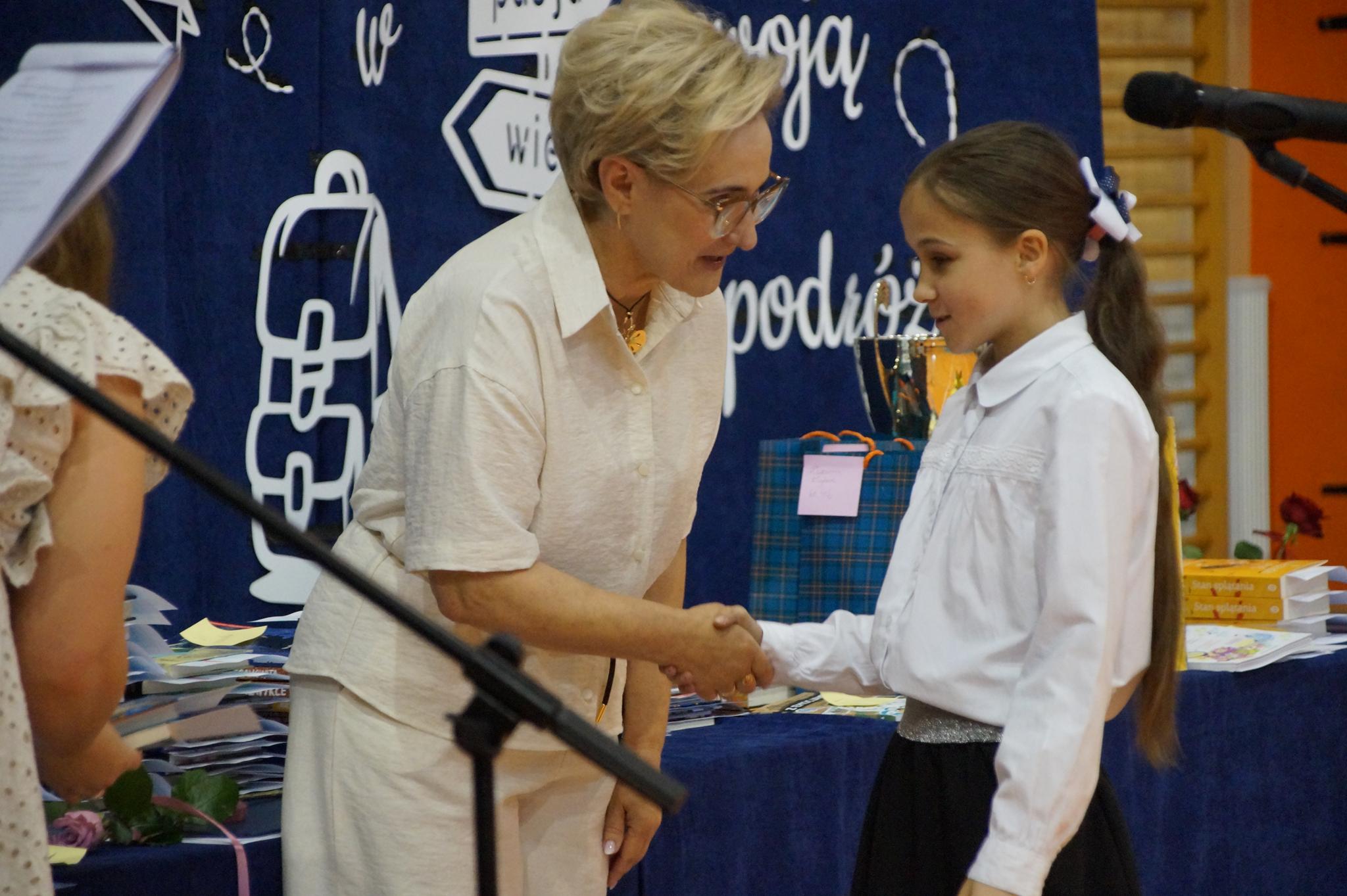 Podczas uroczystości dyrektor Małgorzata Szczucka, wicedyrektor Emila Jagiełło, przedstawicielka Rady Rodziców pani Nicola Guźniczak z wychowawcami wręczyli nagrody i wyróżnienia. Pani dyrektor podziękowała wszystkim za zaangażowanie w realizację szkolnych projektów i przedsięwzięć.