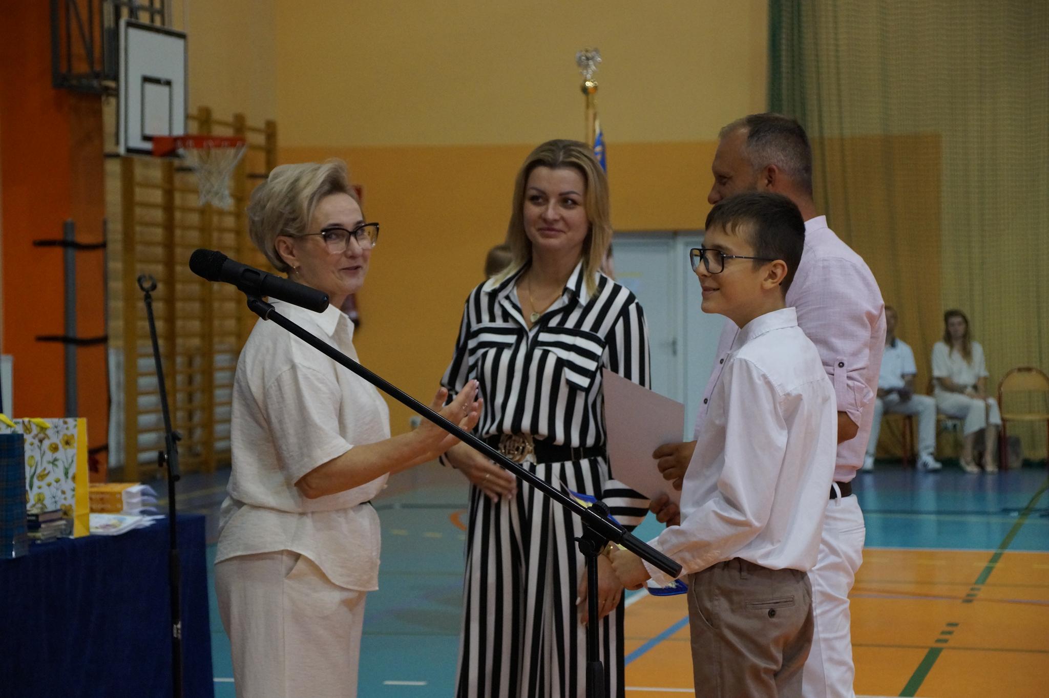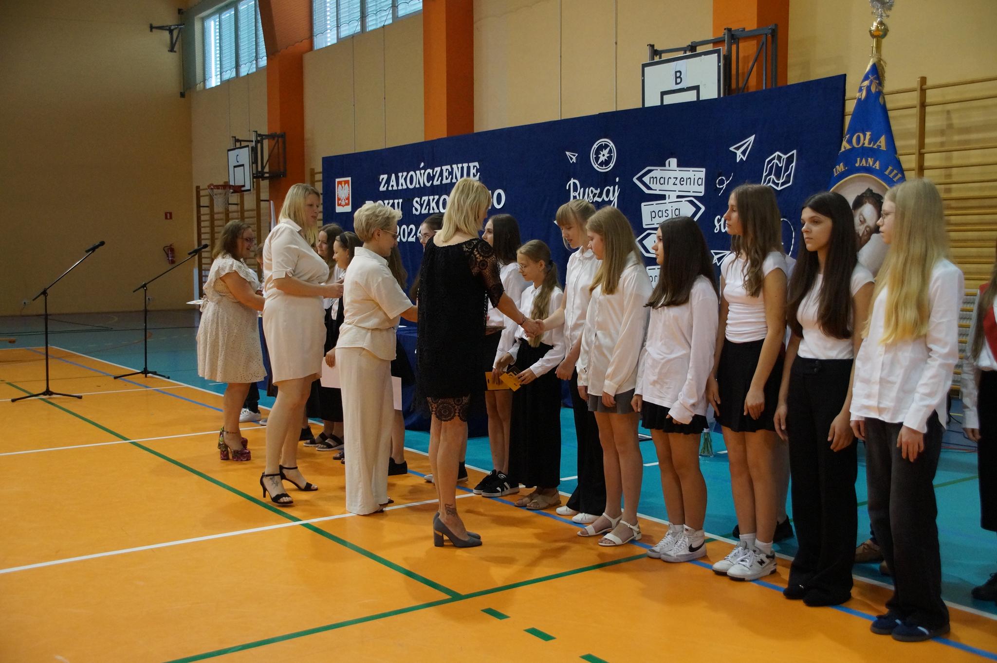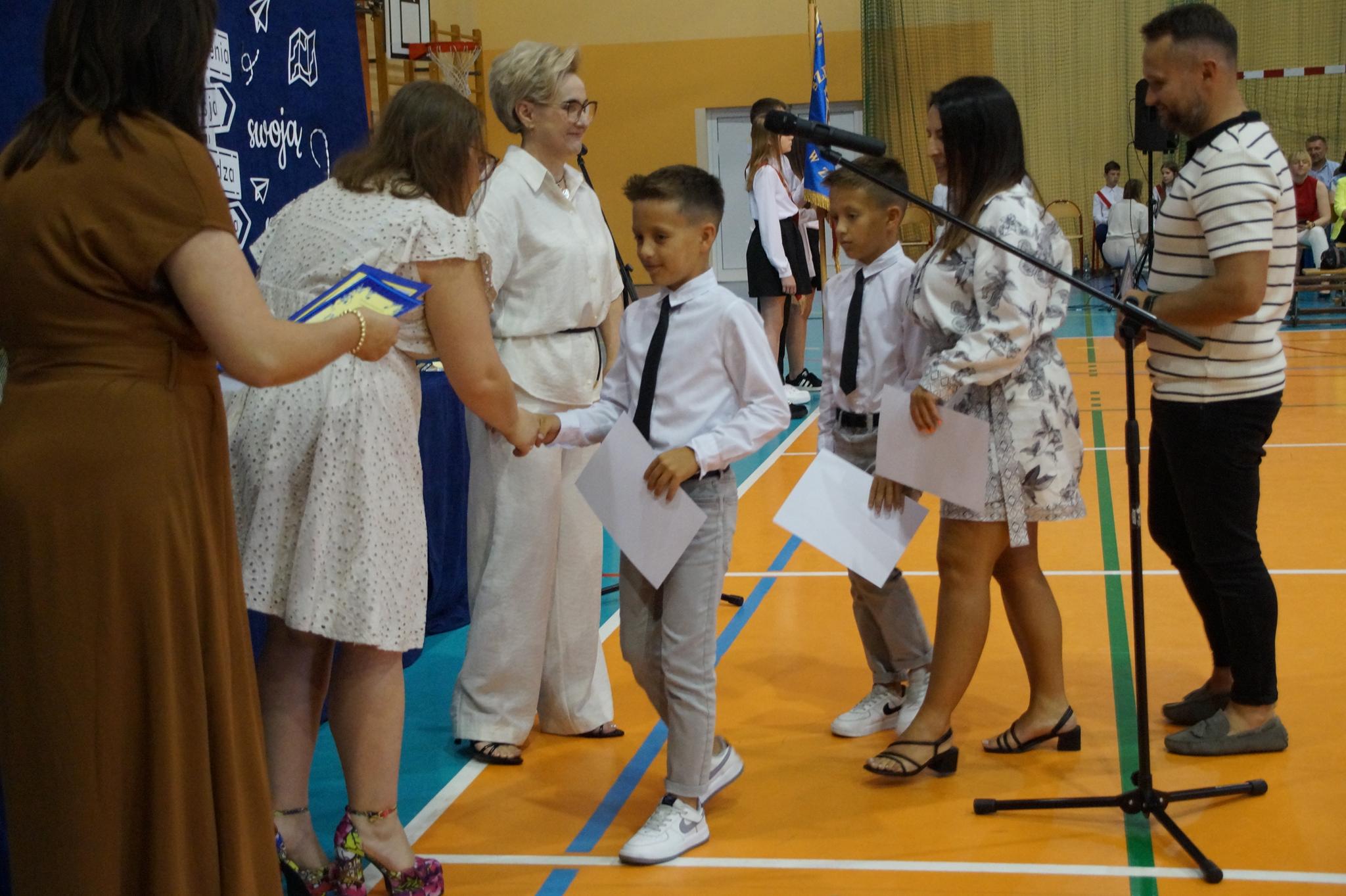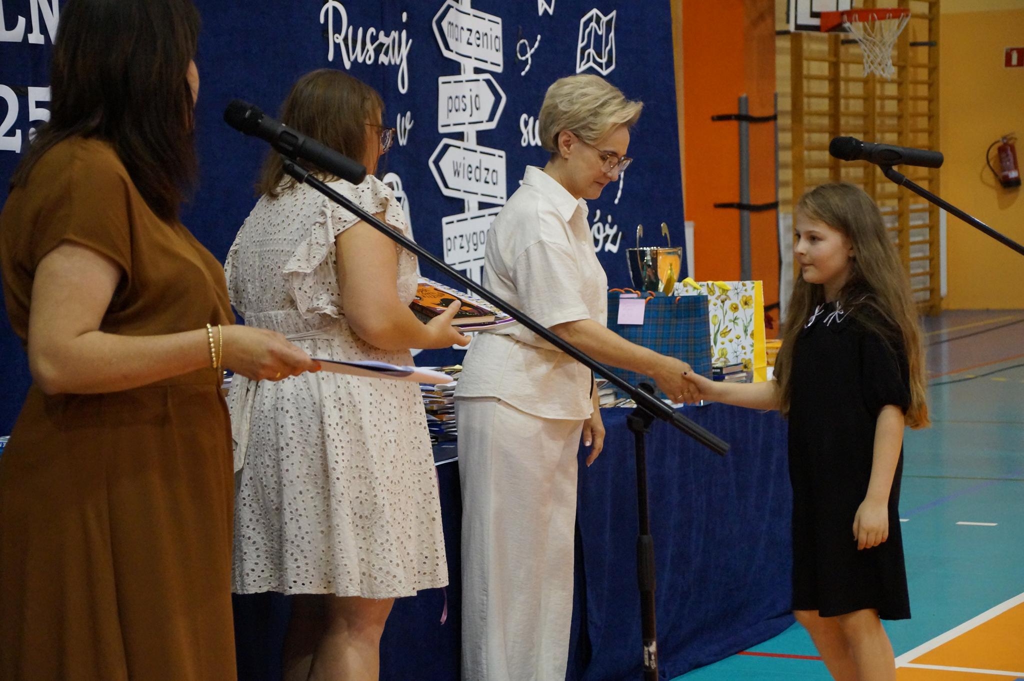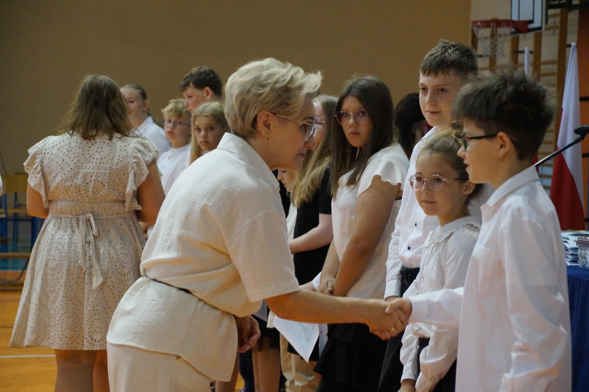 Podczas uroczystości dyrektor Małgorzata Szczucka, wicedyrektor Emila Jagiełło, przedstawicielka Rady Rodziców pani Nicola Guźniczak z wychowawcami wręczyli nagrody i wyróżnienia. Pani dyrektor podziękowała wszystkim za zaangażowanie w realizację szkolnych projektów i przedsięwzięć.