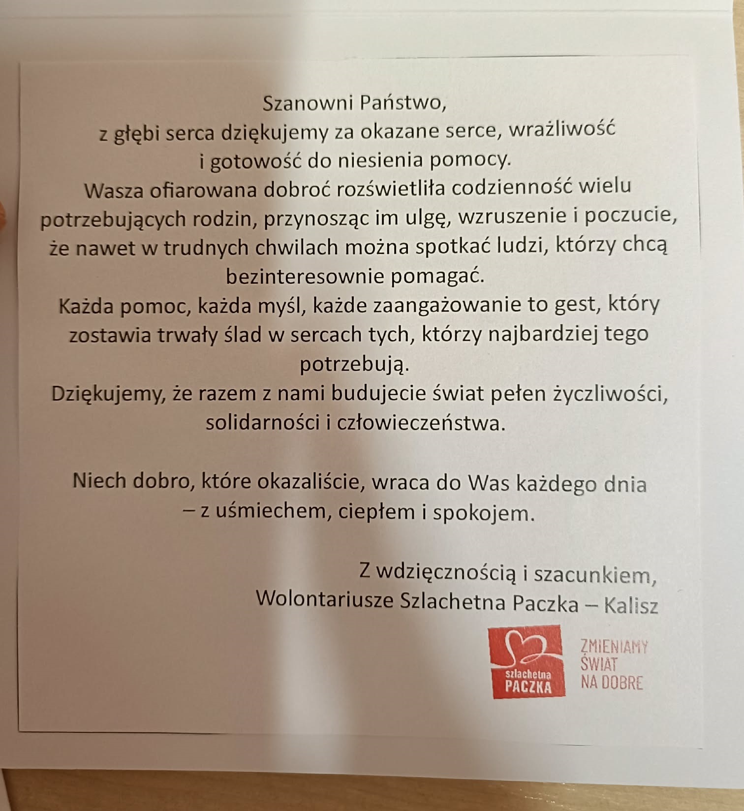 Za okazane wsparcie i zaangażowanie szkoła otrzymała pisemne podziękowania od wolontariuszy Szlachetnej Paczki z rejonu Kalisz oraz Fundacji „Klucz”. W przesłanym liście wyrażono wdzięczność za bezinteresowną pomoc, podkreślając, że nasze działania wniosły realną ulgę, nadzieję i poczucie solidarności w życie potrzebujących rodzin.
