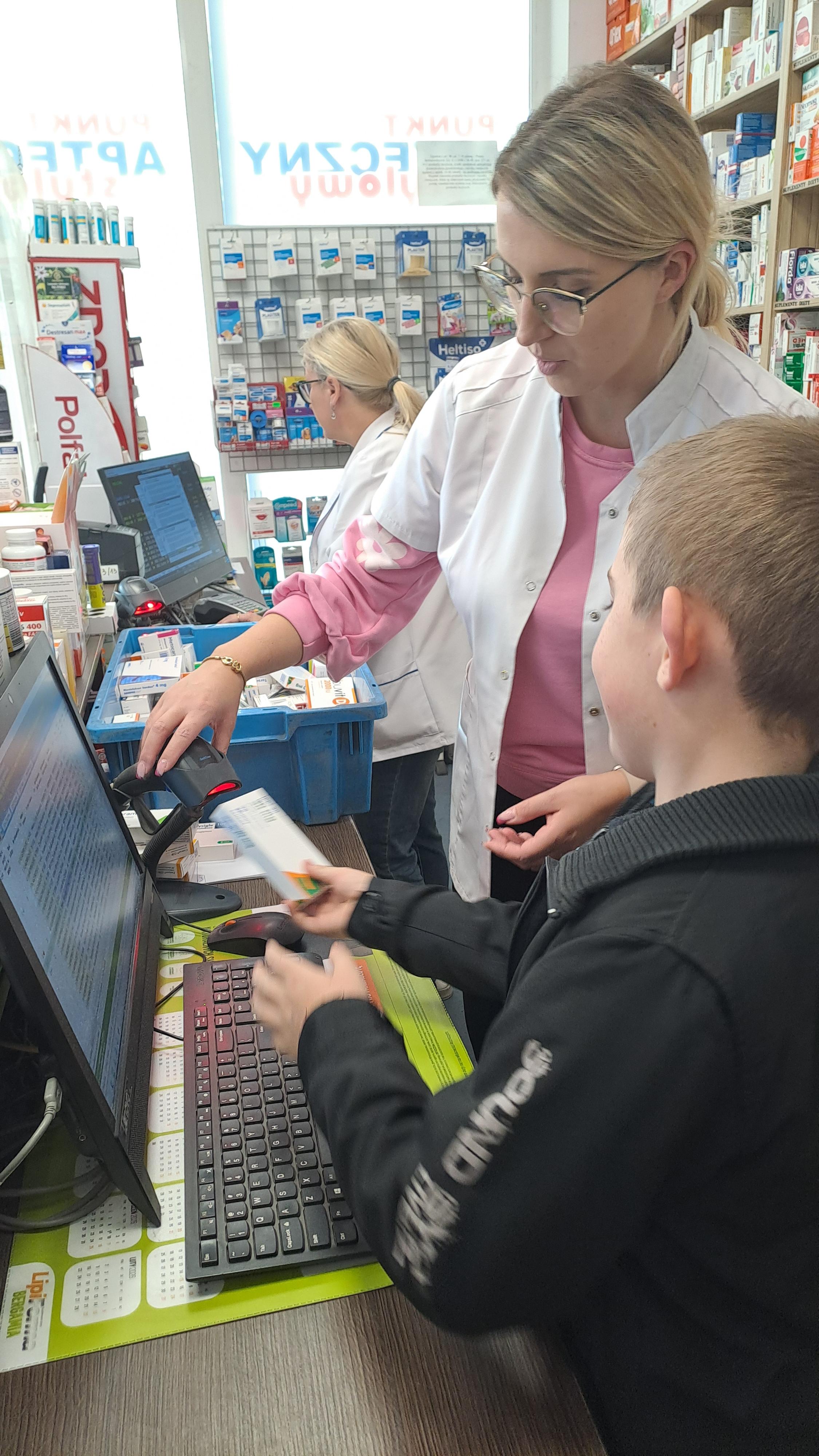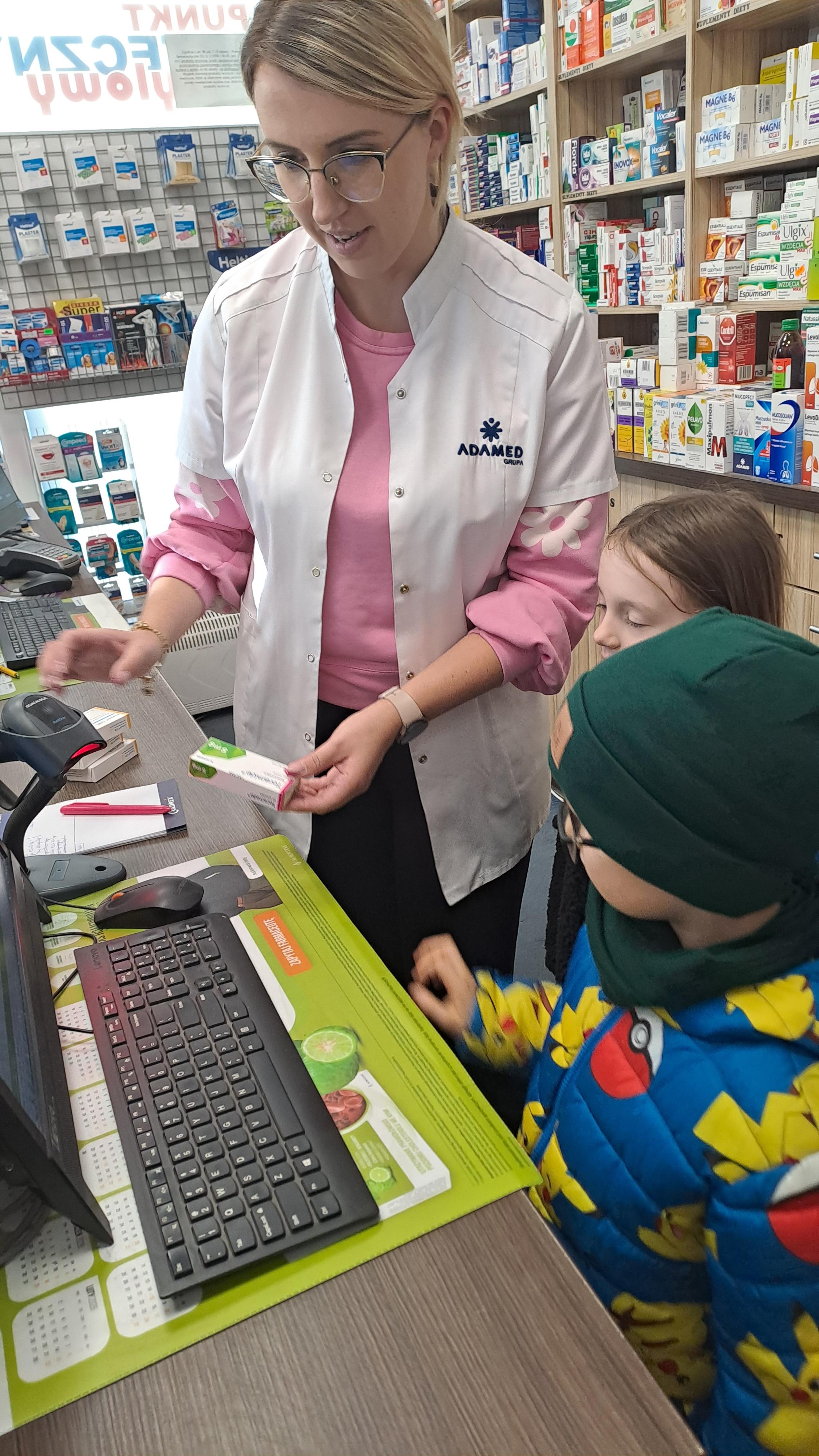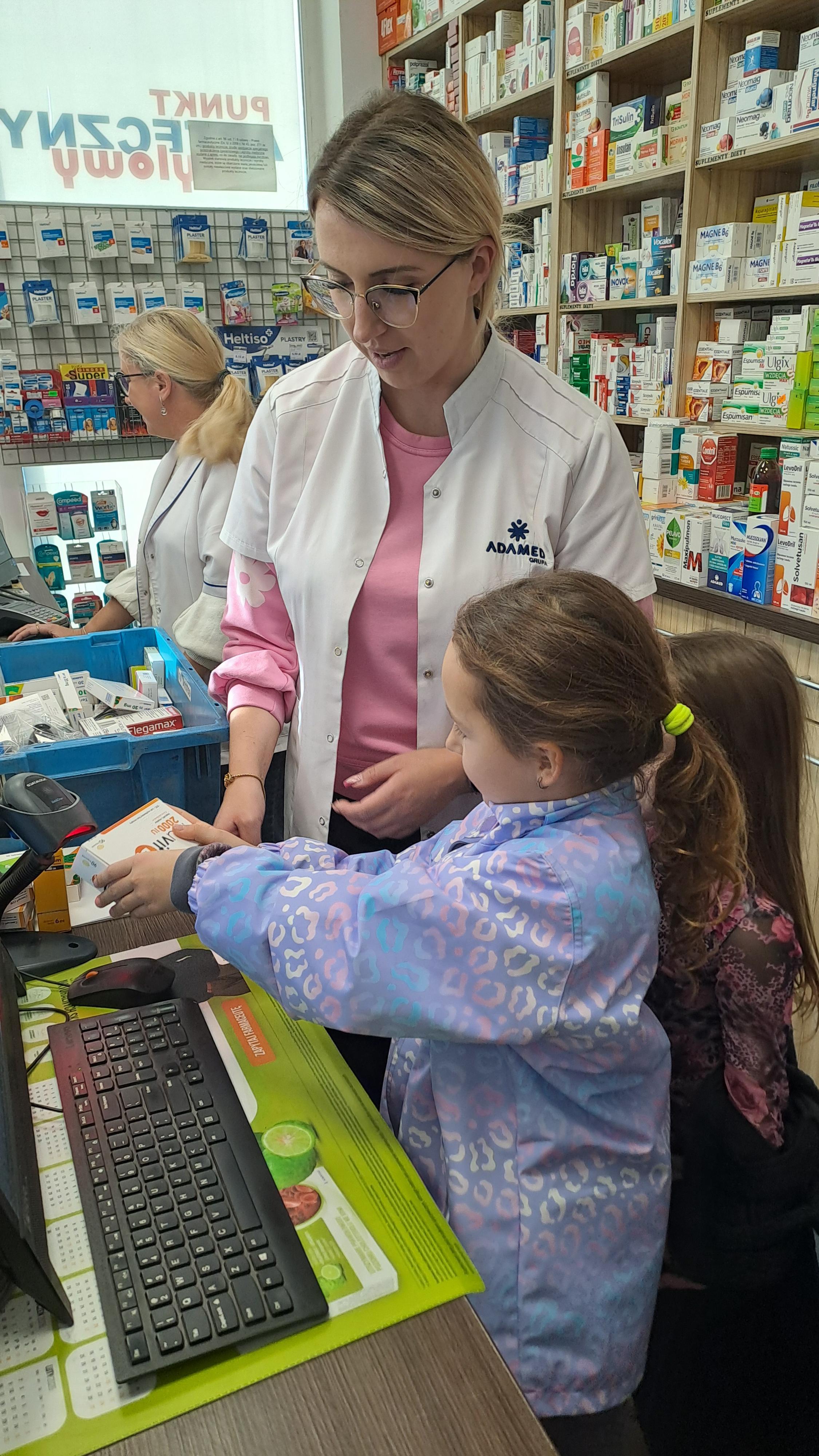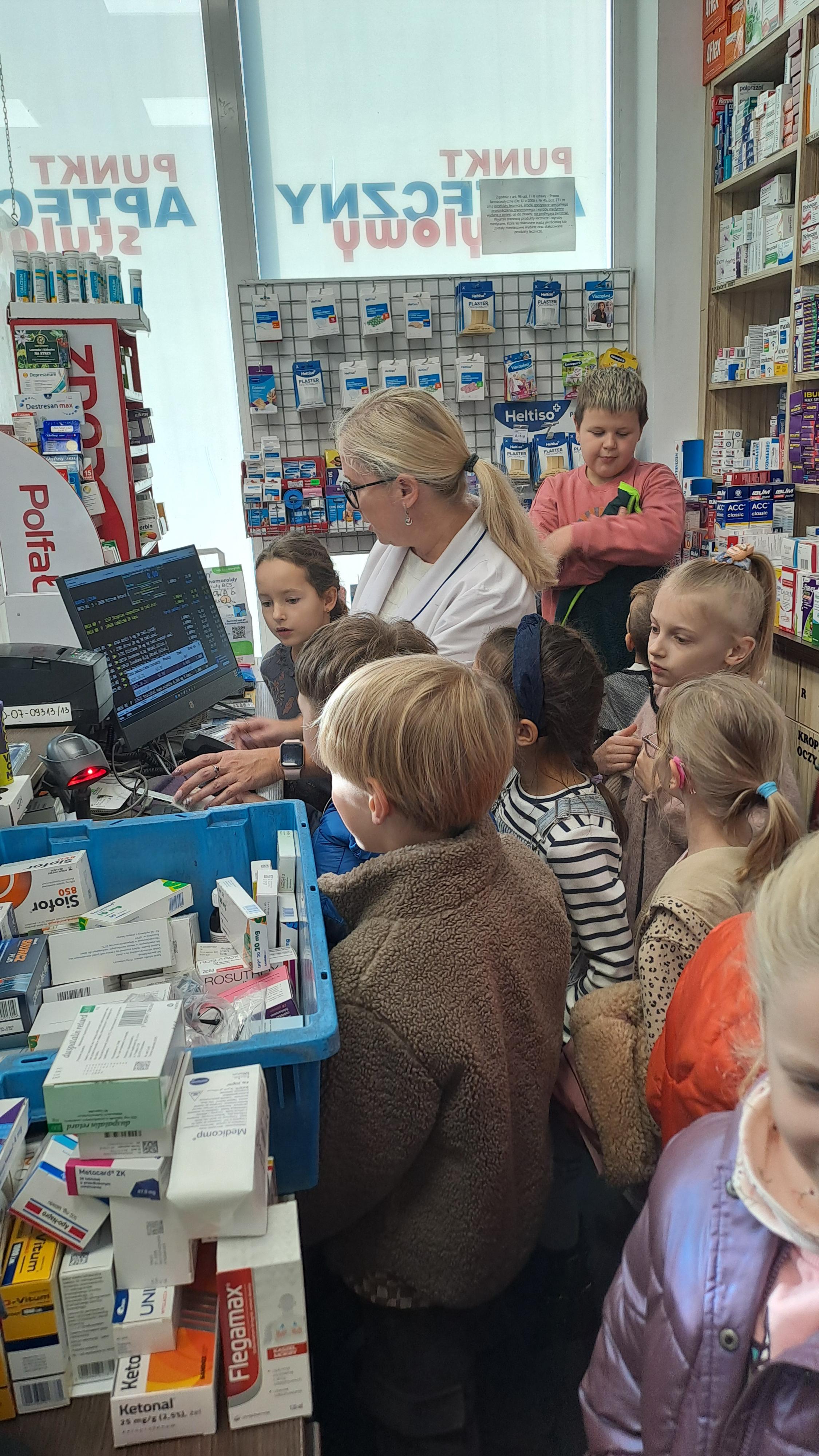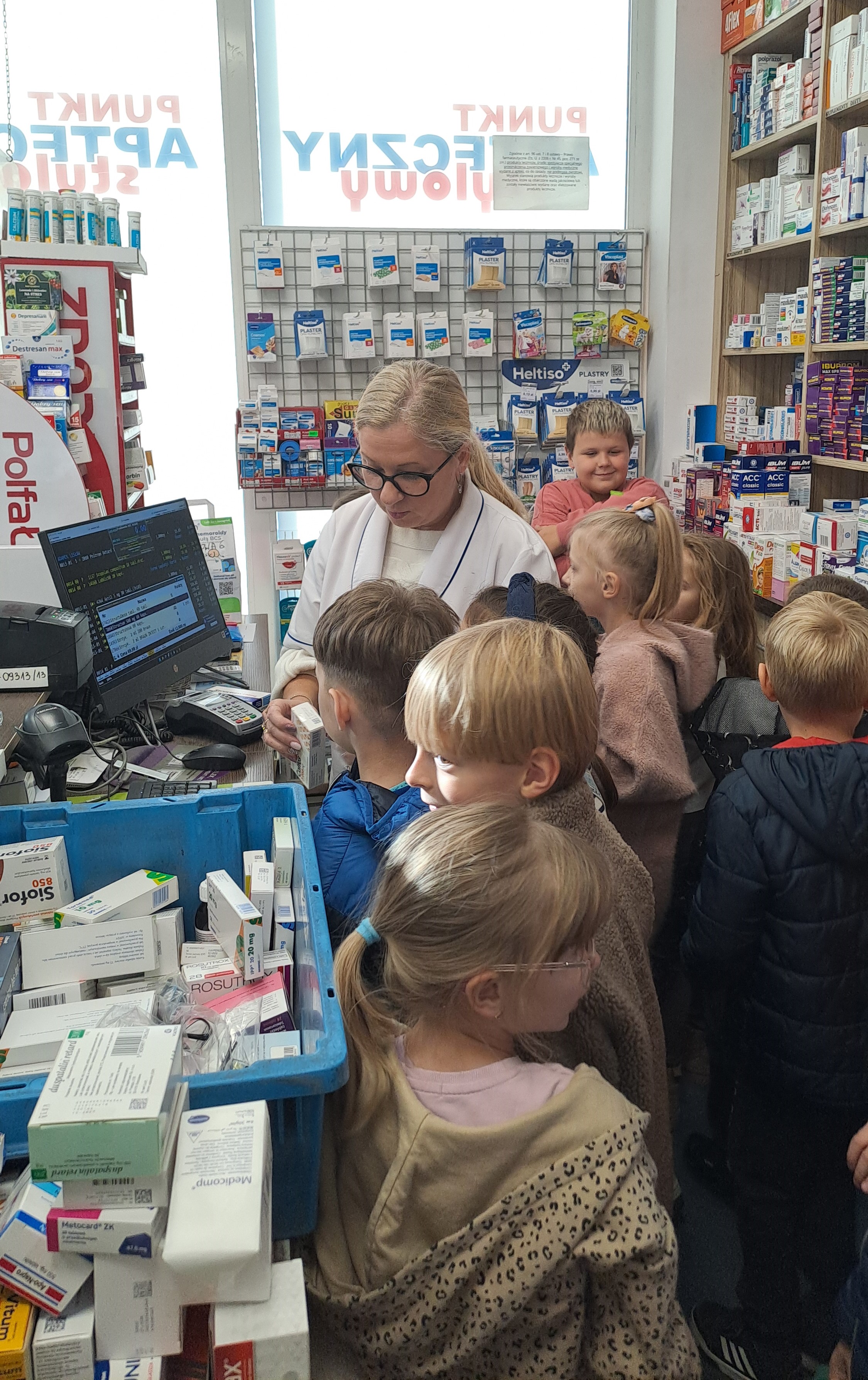 23 października uczniowie klasy pierwszej odwiedzili pobliską aptekę. Celem wizyty było poznanie zawodu farmaceuty oraz zdobycie wiedzy o tym, jak wygląda codzienna praca w aptece. Podczas spotkania uczniowie zobaczyli, jak właściwie przechowuje się leki, poznali zasady ich bezpiecznego stosowania oraz dowiedzieli się, jakie znaczenie ma dbanie o zdrowie. Największe zainteresowanie wzbudziło oglądanie zaplecza apteki i rozmowa z paniami farmaceutkami, które chętnie odpowiadały na pytania dzieci.